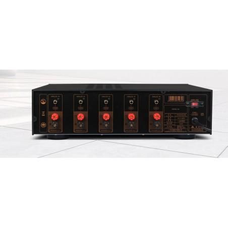 Ingresso segnale audio analogico a 5 canali. Indicatore di segnale a 5 vie indipendente, la luminosità cambia con la potenza del segnale di uscita. Amplificatore di potenza audio a 5 canali integrato, potenza di uscita mono fino a 100 W (8Ω). Pannello di trafilatura interamente in lega di alluminio, terminale placcato oro. Sistema di raffreddamento ad aria intelligente.