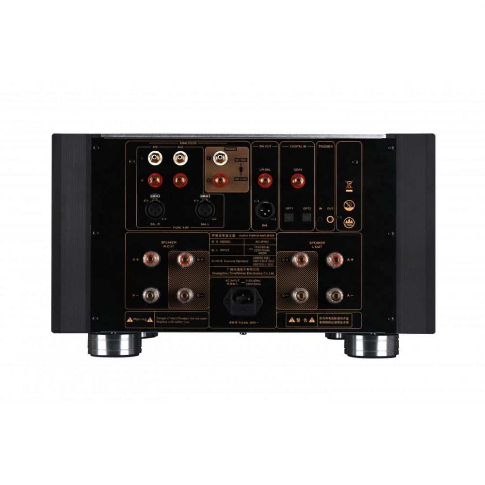 ToneWinner - Integrato Classe A - AD-2PRO+ Support DSD decoding bases on ES9038 chip, lossless audio formats are all supported. Support kinds of inputs of USB, MM/MC, OPT, COAX, BALANCE, ANALOG etc. Support SW balance, unbalance output; Support double line crossover that favors audiophiles. Adopts the well known full balance amplifier circuit design, provide enjoyable sound quality. Adopts 860W big toroidal transformer and up to 120,000uF customize capacitors, uses 24pcs Toshiba transistors to guarantee enough power drive, can match with different world high end speakers. Internal mechanical design with independent and shield cabinets, makes nearly 0 ground noise.