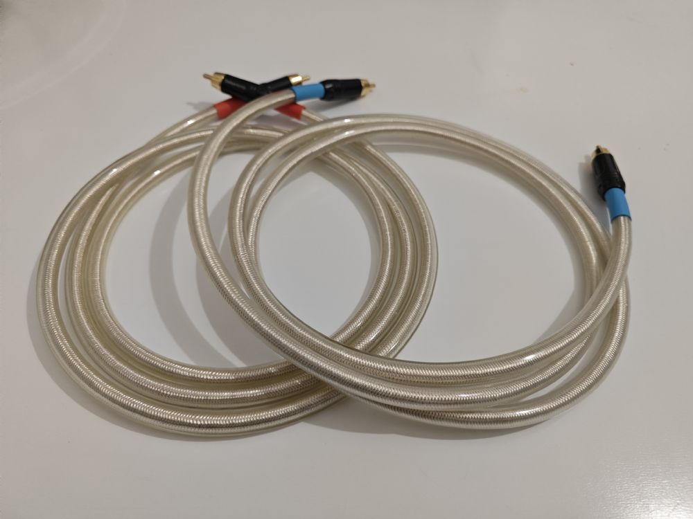 Fantastico cavo di segnale in puro argento multifilare, doppia schermatura, foglio di rame e calza in rame argentato, praticamente immune a disturbi terminato con ottimi connettori rca nati su mie specifiche, e saldature al 3% di argento cavo dal suono molto rifinito e una ottima trasparenza