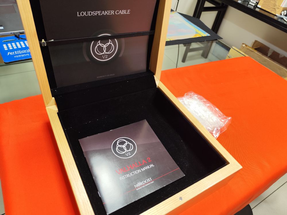 Il cavo per diffusori Valhalla 2 è composto da ventotto conduttori divisi in quattro gruppi da sette. Ogni conduttore è realizzato in rame solido privo di ossigeno al 99,999999% e placcato con 85 micron di argento. Un avvolgimento a doppio monofilamento viene applicato e avvolto elicoidale attorno a ciascun conduttore prima che una guaina in FEP di precisione venga estrusa esternamente. La velocità di trasmissione del cavo è estremamente elevata, pari al 97% della velocità della luce. Il V2 esemplifica la tecnologia all'avanguardia con segnali a larghezza di banda molto ampia e sfasamento minimo. Offre un'incredibile risposta ai transienti e una risoluzione dinamica, preservando la profondità dei dettagli musicali e consentendo agli ascoltatori di seguire facilmente registrazioni complesse. Il cavo ha una lunghezza di 2,60 mt ed terminato a forcella lato amplificatore e banana lato diffusori. E' in condizioni pari al nuovo con scatola in legno ed imballo in cartone originale. Prezzo di listino 17.540 euro