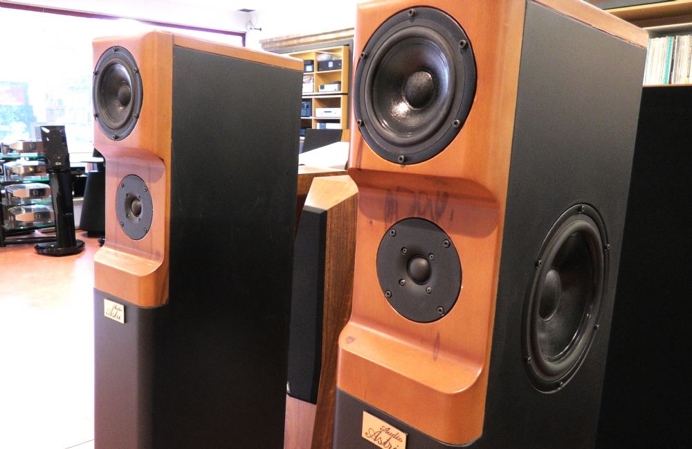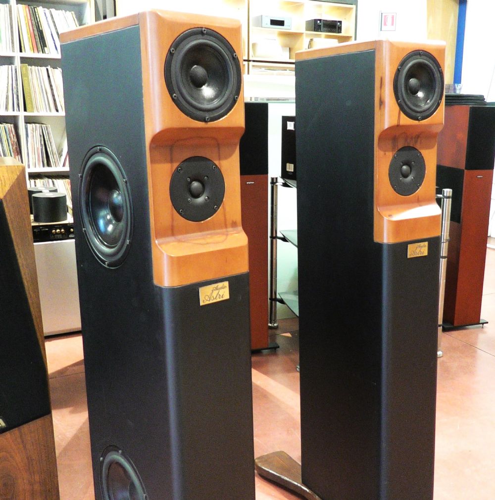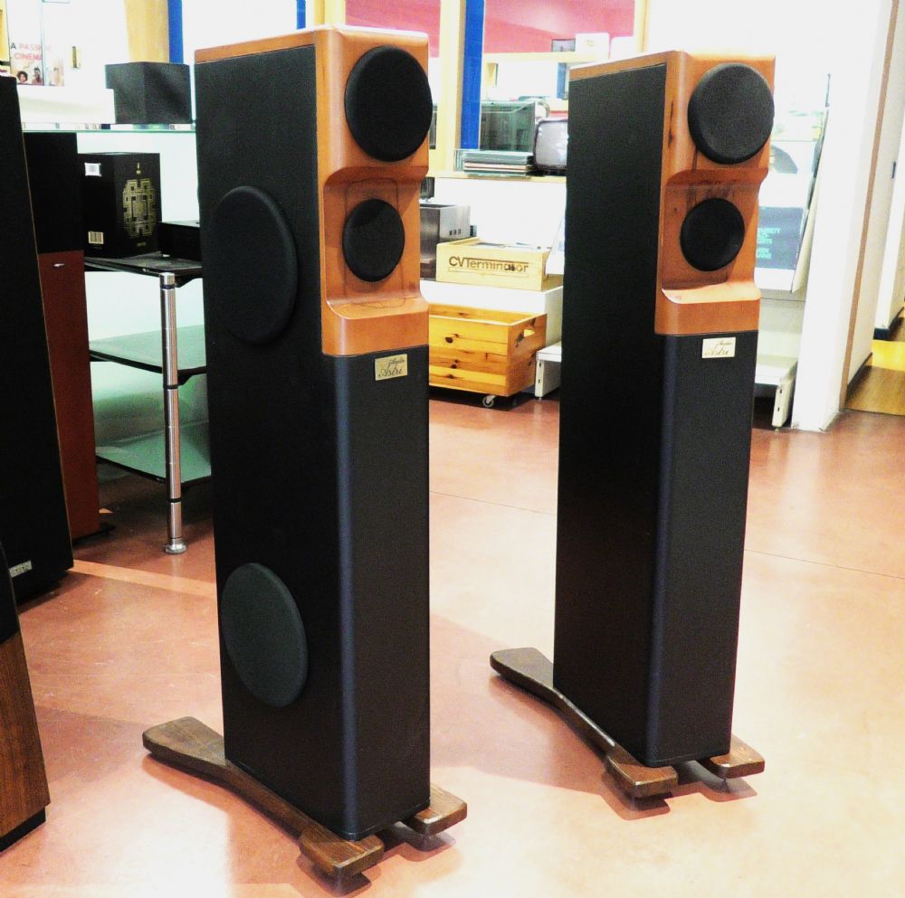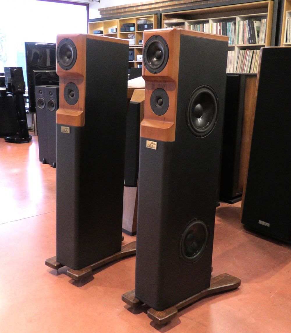Sadr prende il nome dalla stella più grande della costellazione e il suo significato è "il corpo del cigno". Nata per rendere importante l'ascolto. Ogni particolare è stato progettato e messo a punto con strumenti di misura all'avanguardia. Sadr rappresenta la sintesi dell’esperienza tecnica e della sensibilità di ascolto individuale. Risposta in frequenza lineare, dinamica eccellente ed alta efficienza. Si tratta di un diffusore da pavimento a tre vie con doppio woofer con il tweeter posizionato ad un’altezza ottimizzata per il punto d’ascolto. Tutti gli altoparlanti sono realizzati da SEAS per AStri: I due Woofer, posti specularmente sul ripiano laterale, sono trasduttori magneto-dinamici custom da 20 cm. di diametro con cono in carta con trattamento idrorepellente, sospensione in gomma, cestello in pressofusione di alluminio a bassissima incidenza posteriore, gruppo mobile ad alta escursione con bobina da 39 mm avvolta su supporto in alluminio, magnete in ferrite da 110 mm di diametro e 640 g. I woofer lavorano singolarmente in un carico reflex dedicato con allineamento ultralineare accordato a 28 Hz. Il condotto reflex è di tipo tronco conico ad emissione posteriore con foro d’uscita svasato. Il volume è controllato e smorzato dalla presenza di materiale assorbente a fibre lunghe, ignifugo, immarcescibile e non tossico. Il Midrange è un altoparlante con diametro effettivo del cono di 12,7 cm. Il cono è in carta trattata, sospensione in gomma, cestello in pressofusione di alluminio a bassissima incidenza posteriore, bobina da 26 mm avvolta su supporto in alluminio, magnete in ferrite da 90 mm di diametro e 420 g. Il midrange ha una camera chiusa dedicata, separata dai woofer, che assicura il volume di lavoro necessario al componente. Il Tweeter è un componente con cupola in seta e bobina da 26mm avvolta su supporto in alluminio, sospensione in gomma realizzata appositamente per evitare l’utilizzo di olio ferromagnetico, doppio magnete in ferrite da 73 mm di diametro e 340 g, flangia di fissaggio in alluminio da 6 mm di spessore, camera posteriore accordata con labirinto acustico interno. La cassa è realizzata completamente in legno. Disegnata su una struttura portante in multistrato di betulla da 18 mm con trattamento idro-repellente e doppiata nei punti nevralgici. Le pareti laterali sono rinforzate da specifici tramezzi in corrispondenza dei diametri di fissaggio degli altoparlanti. I pannelli intermedi opportunamente posizionati assolvono le funzioni di rinforzi e creano le volumetrie interne. I woofer sono montati lateralmente in modalità simmetrica alla sinistra, ma le casse non sono identificate in quanto il posizionamento dipende molto dalla conformazione ambientale della sala in cui saranno poste a suonare. La struttura principale frontale è completata da pannelli in massello che, oltre a irrigidire ulteriormente il mobile, costituiscono un corpo unico della parte emittente medio alta. Il frontale è costruito partendo da un pannello da 40mm di spessore e lavorato su entrambi i lati con macchine a controllo numerico. La forma anteriore è dettata dalla necessità di riportare su un unico asse i punti di emissione di midrange e tweeter in modo che la loro emissione sia allineata. Questo sistema crea un ritardo temporale per distanza di emissione e fa sì che la loro emissione acustica risulti il più coerente possibile. Le smussature laterali riducono al minimo le riflessioni sul baffle eliminando virtualmente l’effetto bordo. L’estetica del frontale è completata dal logo Astri inciso al laser, quasi fosse la firma dell’autore. Il pannello posteriore realizza la chiusura ermetica e supporta i tubi reflex e il pannello porta terminali. Il filtro crossover è un ultralineare a schema parallelo con tagli a 6dB/ott. Le celle utilizzano induttori con rame da 1 mm avvolti su nucleo ad altissima permeabilità, condensatori in polipropilene a doppia metallizzazione da 250V con un Delta inferiore allo 0,01%, resistori da 15W avvolti con tecnologia Ayrton Perry anti-induttiva. Sono in buone condizioni senza graffi, con griglie di protezione magnetiche in tessuto. Il prezzo di listino era di 12.000 €