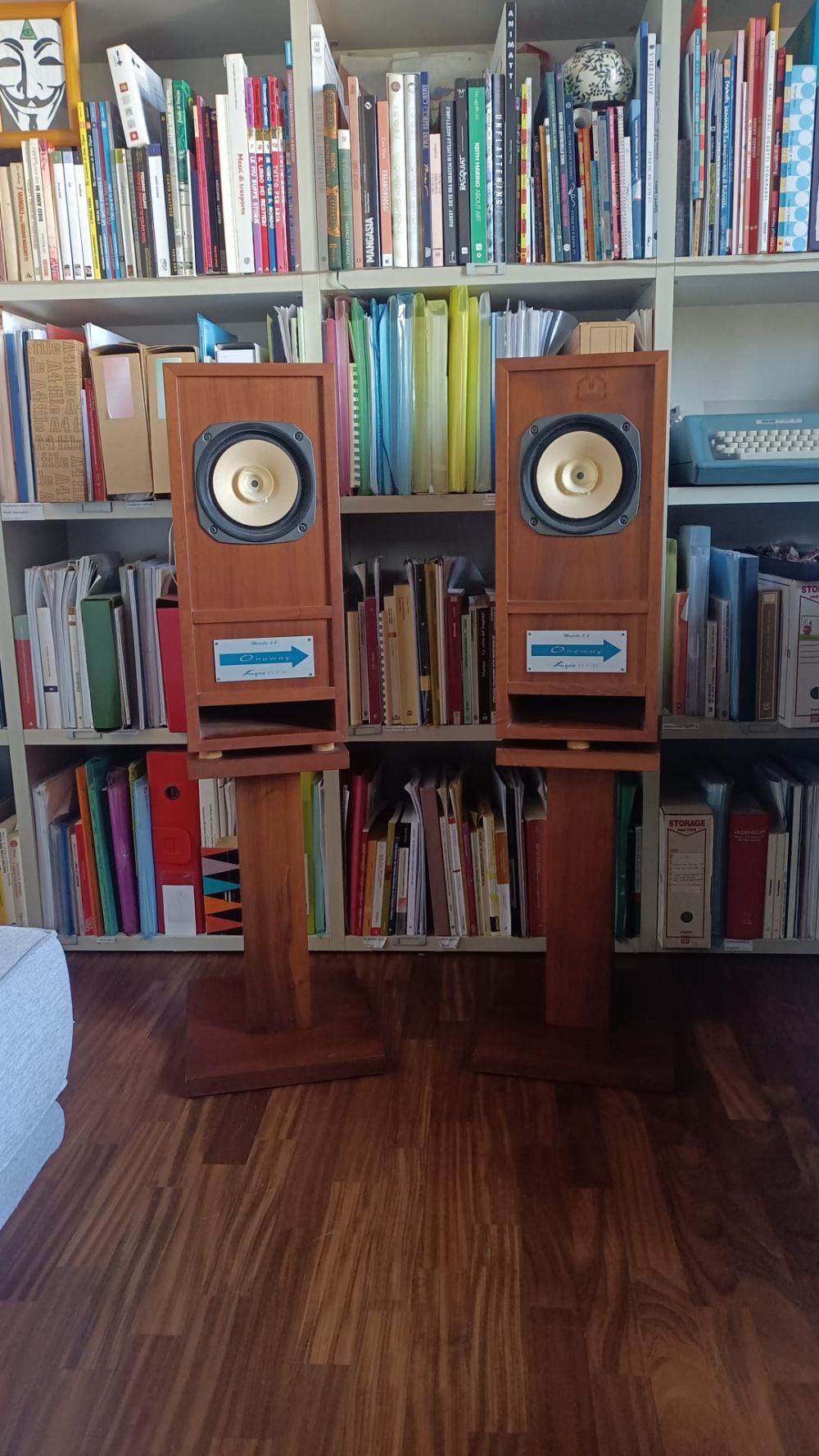 DUE Diffusori acustici artigianali con piedistalli di supporto removibili in legno massiccio. Potenza RMS: 35 Watt, Amplificatore consigliato: da 1 a 70 watt, Risposta in frequenza: 30 Hz ➗ 29 kHz ± 6 dB, 50 Hz ➗ 18 kHz ± 3 dB, Impedenza nominale: 8 ohm, Efficienza: W/m: c.a. 95 dB, Tipologia: bass reflex caricato a tromba. Dimensioni Casse: 24 x h. 54 x 30 cm, Peso, 10kg. Dimensioni supporto: h. 51, base di appoggio 30x35.