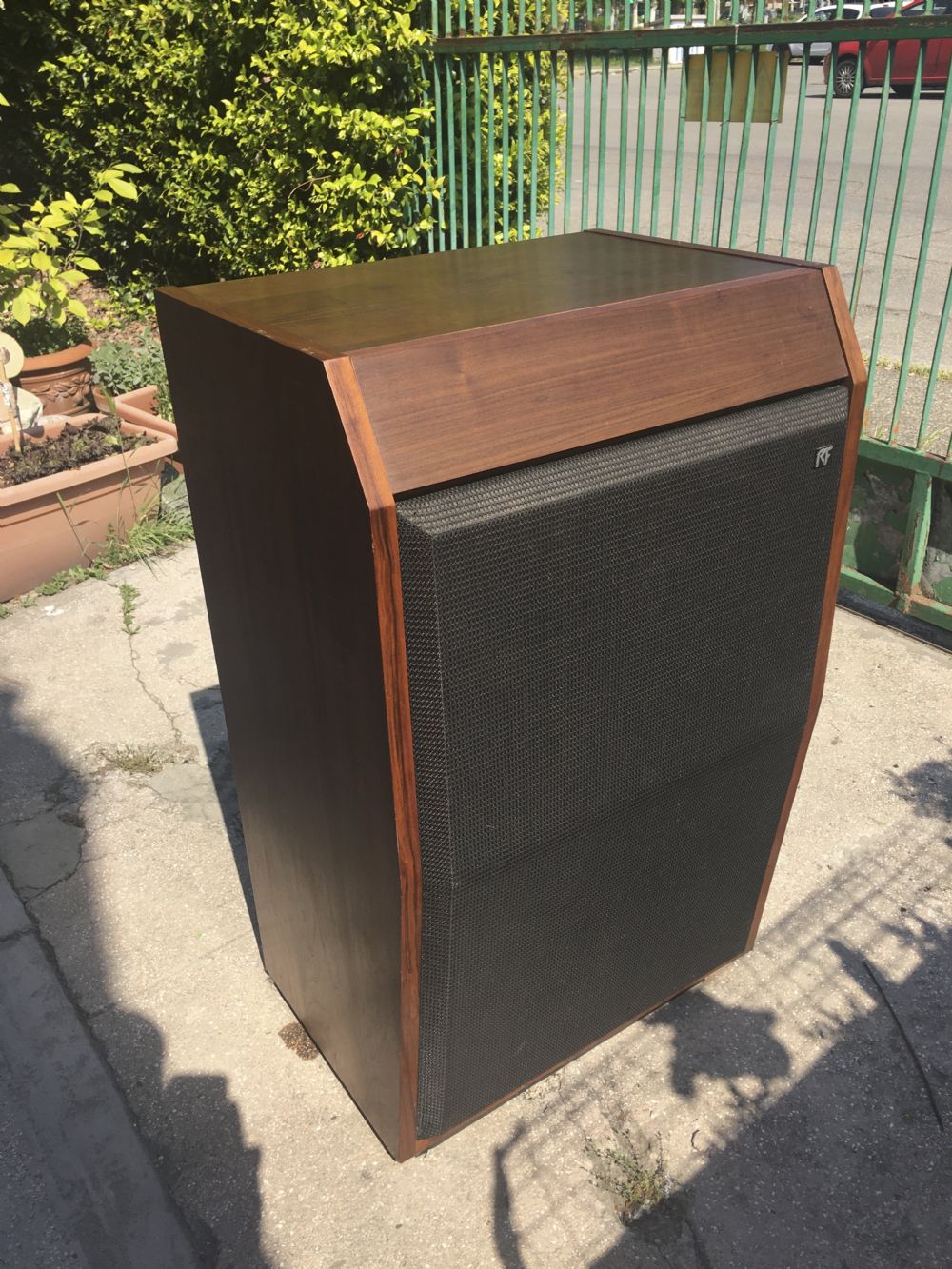 In eccellenti condizioni, funzionanti, tutti i componenti sono originali, nessuna sostituzione, restauro o riparazione. Tipo: Bass Reflex, 3vie, 1 woofer 380mm, 1 midrange 300mm, 1 tweeter a cupola. Freq. di crossover 500-5000Hz. Freq. Risp. 20-20000Hz, Z=8Ω P(RMS)=150W (Picco)=220W 62x99x49cm