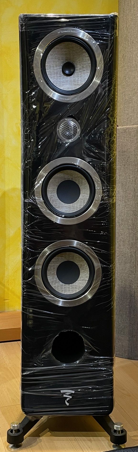 Coppia diffusori da pavimento, 3 vie, bass reflex, woofer "FLAX" con complesso magnetico NIC, midrange "FLAX" con sospensione TMD e complesso magnetico NIC, tweeter in Beryllium IAL3, 40-300 W Frontale e cabinet nero high gloss