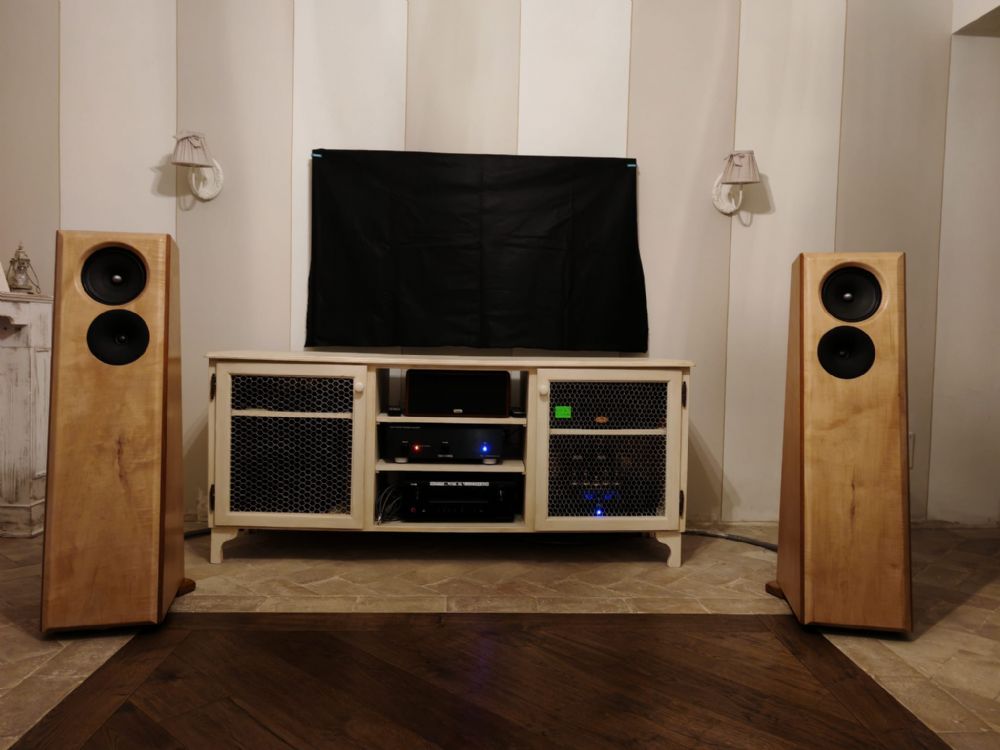 Come da titolo vendo intonsi diffusori con sensibilità 93.5 db, in vero legno massello, costruiti a regola d'arte da abile e competente artigiano, da abbinare a amplificatore valvolare per un risultato degno di nota, possibile biamplificazione in quanto presenti due coppie di morsetti posteriori.