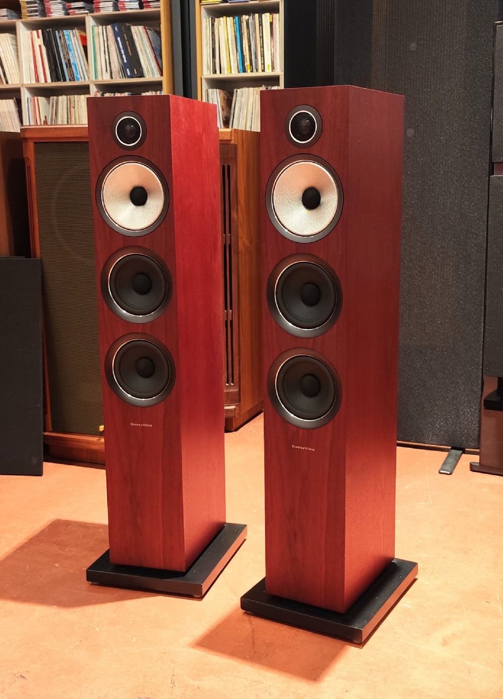 Le B&W 704 S2 sono delle graziose casse acustiche da pavimento in forma slim costruite secondo tecnologie brevettate dal famoso marchio Bowers and Wilkins. Il punto di forza della tecnologia è il midrange Continuum da 13 cm, costituito da un cono fatto con un materiale ben più resistente del Kevlar. Utilizza la tecnologia FST riscontrata in passato solo nei prodotti di fascia alta dell'azienda. La tecnologia FST sostituisce la tradizionale guarnizione in gomma con un anello in schiuma appositamente progettato. Per il tweeter B&W ha scelto di sviluppare ulteriormente la sua unità a cupola in alluminio da 25 mm, con l’aggiunta di un rivestimento in carbonio da 30 micron di spessore e un ulteriore rinforzo sotto forma di un anello in carbonio. Ciò conferisce al tweeter una portata estesafino a 47 kHz, anziché a 38 kHz come nel design interamente in alluminio. Il tweeter è disaccoppiato dal cabinet principale come avvieneper il midrange. La camera smorzata dietro la cupola continua, e ha la funzione di assorbire qualsiasi suono posteriore. I bassi sono riprodotti da due driver da 13 cm. Questi utilizzano coni con spessore e rigidità variabili lungo il profilo, per offrire la combinazione di smorzamento e rigidità desiderata dagli ingegneri. L'uscita dei bassi è ottimizzata da una delle porte reflex con le tipiche fossette di B&W al fine di ridurre rumore e distorsione. E’ facile notare che questi diffusori godono di un’ottima costruzione. La sensibilità dichiarata è di ben 88 dB/W/m, ma basta dare un'occhiata alle specifiche tecniche per vedere che l'impedenza nominale di 8 ohm scende a un minimo di 3,1 ohm. Ciò suggerisce di adottare una amplificazione generosa con buona corrente dagli 80 watt in su per avere un funzionamento convincente. In questo caso le 704 S2 si animano in maniera esaltante con un suono potente e generoso, che sembra in contrasto con la loro forma fisica. I due driver per i bassi penetrano in profondità e conferiscono alla presentazione un piacevole grado di solidità e autorevolezza. Hanno sempre il controllo, anche quando il volume aumenta. Non si avverte alcun senso di indurimento o congestione quando la musica diventa impegnativa. L'immagine stereo è buona, con strumenti e suoni posizionati con precisione. Rimangono fermi anche durante i cambi di dinamica. Dal punto di vista timbrico, il tutto risulta ben integrato ed equilibrato se i diffusori sono posizionati correttamente, anche quando suonano a volumi alti. Tra i pregi concludendo con questi diffusori si ottiene un suono pregno di compostezza e raffinatezza con una superba riproduzione delle medie frequenze, il tutto coadiuvato da un’ottima costruzione. Sono molto ben tenute, con una bella rifinitura rosewood, complete di accessori quali piedini in gomma e punte e sottopunte originali. Con griglie magnetiche in tessuto.