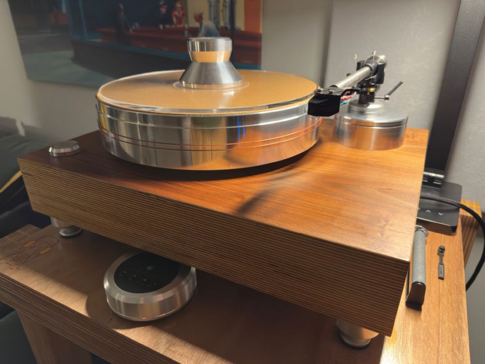 completo di tutto, anche degli optional ufficiali: doppia puleggia, 2 coppie di cinghie (di cui le nuove in silicone rosso da 120 euro), super- alimentatore , clamp da 600gr. Completo di braccio Goldnote B7Ceramic (listino 2290€) e testina Goldnote Machiavelli Red (1.440€) Like new, pesa 40 chili