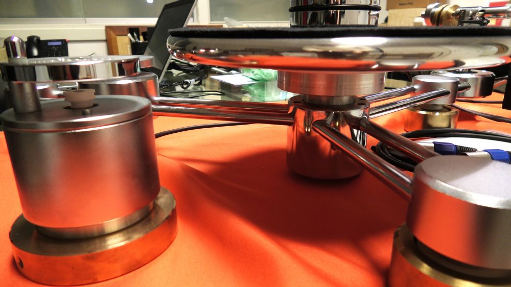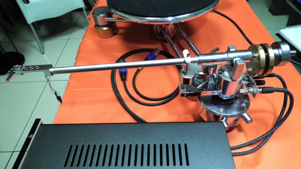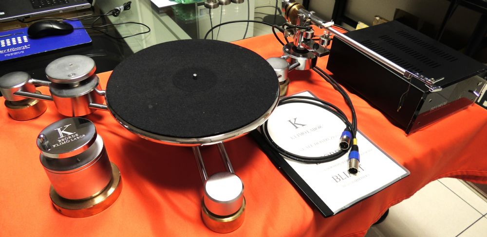 Il Klimo Beorde è uno straordinario giradischi in grado di eliminare alla radice le interferenze tipiche dei giradischi tradizionali: i punti di disaccoppiamento si trovano sotto ai cilindri di sostegno, sotto il piatto e soprattutto sotto il perno, dove un calibrato campo magnetico consente al gruppo perno-piatto di levitare sospeso dalla forza dei magneti. Questa sospensione magnetica diventa non solo un sistema di isolamento, ma anche il sostegno stesso del piatto, sostituendo in modo definitivo il perno su biglia reggispinta in bagno d’olio, elemento che da sempre rappresenta la maggiore criticità nei giradischi convenzionali. In questo caso agisce un cuscinetto d’aria che sostiene il perno senza generare il minimo rumore meccanico, preservando l’integrità del segnale e garantendo una silenziosità assoluta anche in presenza di piatti di massa elevata. E’ presente una base per poter montare un secondo braccio. Nel caso si utilizzi un solo braccio è possibile, volendo, accorciare la larghezza del giradischi (da 70 a circa 50 cm) tramite l’utilizzo di due barre (accluse) da sostituire a quelle montate in foto. E’ disponibile una testina Klimo MC modello Ertanax praticamnte nuova, appena ristilata in fabbrica. Prezzo di listino della sola testina nel 2017: 4.850 euro. Il giradischi completo di testina è venduto al prezzo di 5.000 €. Il fonorivelatore Ertanax è a bobina mobile ed ha una uscita piuttosto sostenuta, 1 mV tanto che è possibile quasi utilizzarlo anche con un ingresso MM di buona sensibilità. Il corpo potrebbe essere definito come “seminudo”, dato che dell'involucro esterno tradizionale restano solo la parte frontale, quella superiore, e le due protuberanze di protezione per lo stilo. Questo è realizzato con un taglio Gvger S tipo I, e montato su un cantilever in boro. Le bobine si avvalgono di materiali di primissima qualità per il loro avvolgimento, effettuato con argento, mentre i magneti sono in alnico. La massa del braccio richiesta va da 9,5 a 18 grammi e la testina si sposa a meraviglia con il braccio in dotazione Bliant. Il design del Klimo Beorde non è mai fine a se stesso: forme e materiali sono studiati per ridurre le risonanze indesiderate, mentre ogni componente, dalle parti strutturali fino alle minuterie, viene realizzato con precisione estrema e con materiali scelti esclusivamente in base alla loro efficacia. Il motore, lo stesso impiegato nel modello di riferimento Tafelrunde, assicura prestazioni impeccabili e stabilità di rotazione, garantendo al Beorde caratteristiche tecniche di altissimo livello pur mantenendo un’impostazione più essenziale. Il risultato è un giradischi che mette in primo piano l’essenza della musica su vinile: un approccio tecnico rigoroso e soluzioni costruttive ingegnose, unite a un funzionamento semplice e immediato, per un’esperienza d’ascolto autentica, pura e coinvolgente. Il braccio Bliant si distingue per un progetto altamente innovativo, che rinuncia alla tradizionale architettura imperniata e unipivot. Al contrario, impiega un sofisticato sistema di levitazione magnetica per il movimento orizzontale, che consente di disaccoppiare l’articolazione e sospendere l’intero braccio in modo estremamente fluido. Questo approccio consente non solo di ridurre drasticamente gli attriti ma anche di ottenere una stabilità eccezionale durante la lettura del disco. La lunghezza straordinaria della canna, superiore ai 13 pollici, permette di ridurre l’errore tangenziale a livelli minimi, garantendo così un tracciamento di altissima precisione, anche nelle sezioni più interne del vinile, notoriamente più critiche. Il sistema verticale, basato su un asse portante con accoppiamento multipivot, contribuisce ulteriormente alla precisione complessiva, offrendo un movimento morbido e controllato in ogni fase della lettura. L’intero braccio è progettato per minimizzare le risonanze, grazie a una struttura disaccoppiata in più punti, in particolare intorno all’articolazione, sviluppata per assicurare attriti praticamente nulli e una durabilità nel tempo che ne esalta l’affidabilità. In virtù dell’eccezionale lunghezza effettiva, l’errore tangenziale risulta talmente ridotto da rendere superfluo l’uso del sistema antiskating, spesso fonte di complicazioni nella regolazione e potenziali alterazioni nel comportamento della testina. Questa scelta costruttiva rispecchia anche l’evoluzione delle moderne testine fonografiche, che utilizzano diamanti con geometrie in grado di offrire un’ampia superficie di contatto e quindi pressioni minime sul solco, riducendo drasticamente attriti e usura. I materiali impiegati nel sistema, autolubrificanti e leggeri, garantiscono inoltre una bassa sensibilità alle variazioni termiche, ridotta usura meccanica e una maggiore stabilità nel tempo. L’insieme di queste soluzioni tecniche rende il braccio Bliant non solo estremamente affidabile e preciso, ma anche semplice da configurare e utilizzare.