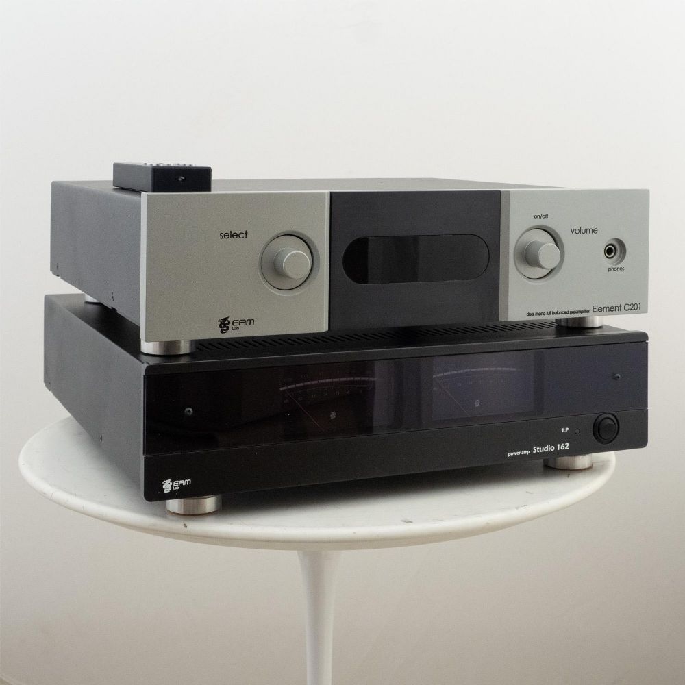 Caratteristiche del finale EAM Lab Studio 162: Potenza: 90 W RMS 8 ohm, 160 W 4 ohm, 250 W 2 ohm. Risposta in frequenza: 20 Hz – 28 kHz (+/- 0,05 dB) / 5 Hz – 100 kHz (+/- 3 dB) Impedenza ingresso: 47 kΩ (XLR), 22 kΩ (RCA) Dimensioni: 37 x 42 x 10 cm. Peso: 15 kg.
