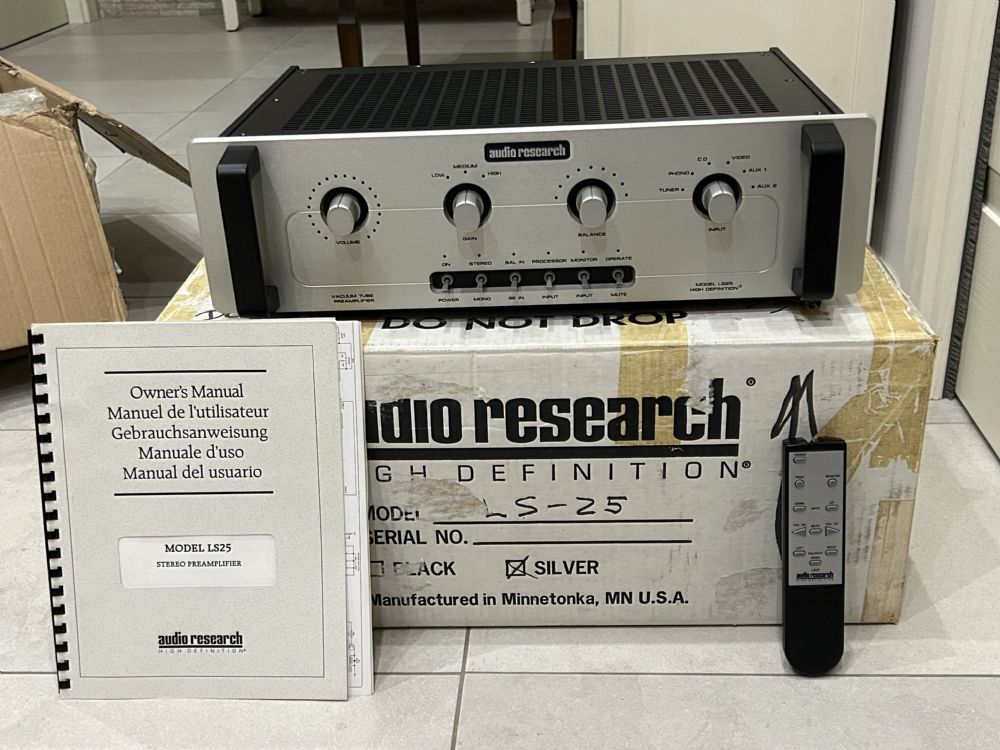 Preamplificatore Audio Research LS25 I° serie la più riuscita, il modello che è equipaggito con 4 6922/ecc88. Il pre è in perfetto stato è completo del suo imballo originale e del manuale è istallato un quartetto di valvole NOS nuove e88cc Philips SQ. Il prezzo non è trattabile!!