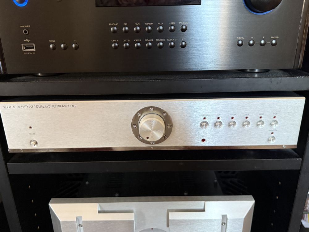 Preamplificatore Musical Fidelity A3 CR. Totalmente dual mono. Cinque ingressi alta uscita, un ingresso phono MM/MC (selezionabile), un'uscita tape monitor. Perfetto sia tecnicamente che esteticamente, con telecomando originale (volume motorizzato). Non spedisco causa mancanza di imballo e peso.