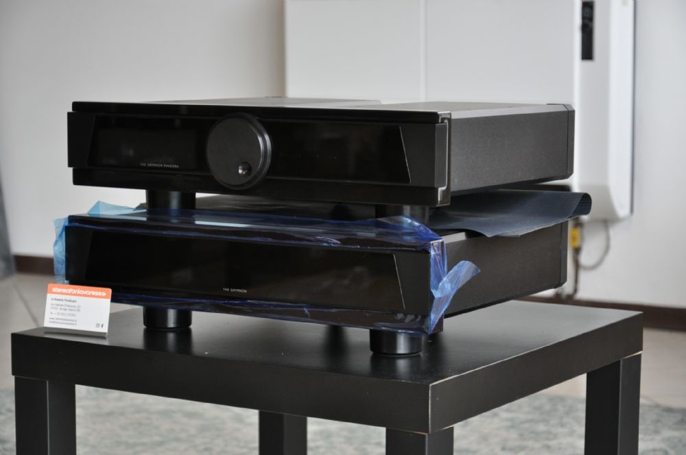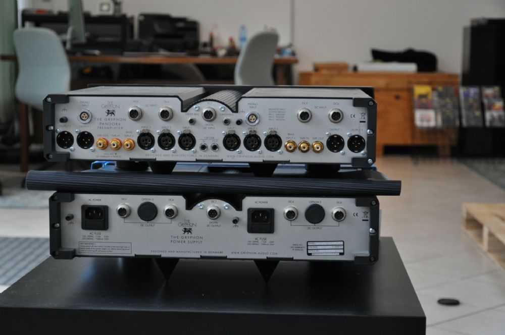 Preamplificatore Gryphon Pandora (sia con phono mm/mc che senza) puro dual mono in classe A totalmente discretaDue banchi di condensatori da 90.000 μF, retroazione negativa nulla, 40 transistor di uscita bipolari ad alta corrente, 3 ingressi XLR, 2 ingressi RCA, 2 uscite XLR 1, uscita RCA (tape), rapporto segnale rumore 20 Hz – 20 kHz < -90 dB, rapporto segnale rumore A < -94 dB, distorsione (THD+N): < 0,005%, guadagno: +18 dB, banda (-3 dB): 0-3 MHz, impedenza d’ingresso bilanciata: 50 kOhm, impedenza d’ingresso single ended: 25 kOhm, impedenza d’uscita: 7 Ohm.Dimensioni (LxAxP): 2 x 48×13,5×40 cm, peso: 7,5 e 10 kg.