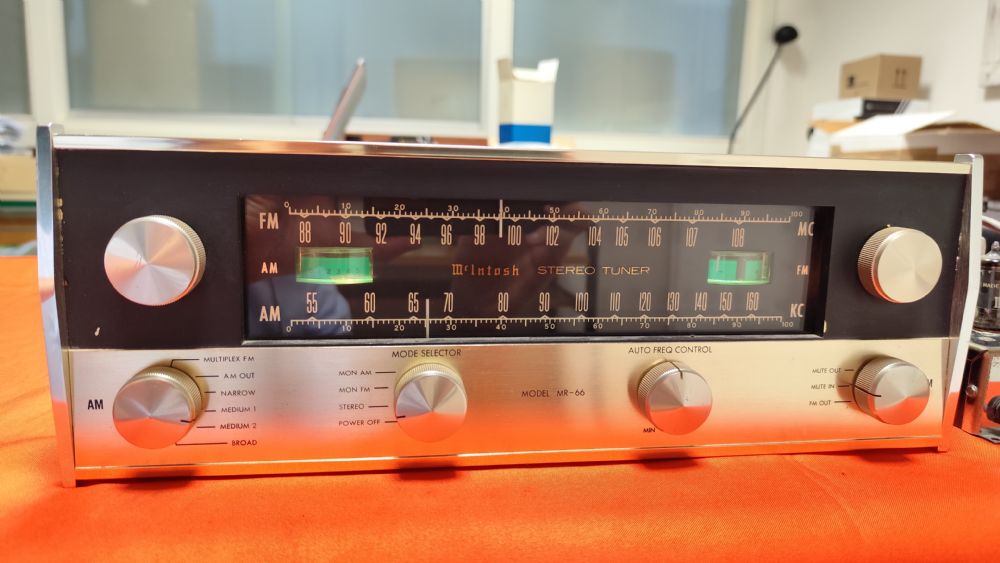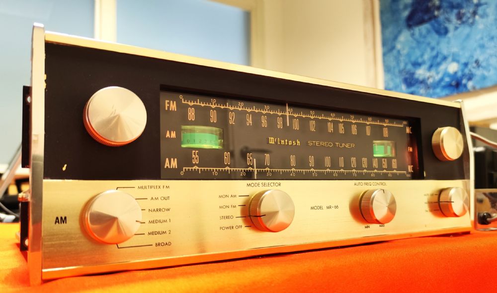 Il McIntosh MR66 è un sintonizzatore stereo AM-FM di precisione con alta sensibilità. Offre la migliore ricezione possibile di trasmissioni AM e FM. Questo modello è originale con alimentazione a 110 volts – in dotazione un ottimo trasformatore Bronson 220/110. L'MR66 include tutte le funzionalità desiderabili ed è stato dotato di decoder stereofonico aggiuntivo Mc Intosh MA6 con valvole nos Mc Intosh. E’ un apparecchio senza tempo, ben tenuto e poco utilizzato, con frontale assolutamente perfetto, come è perfetto il suo funzionamento. L'MR66 è estremamente flessibile nel funzionamento. Riceve trasmissioni FM monofoniche, AM monofoniche e FM stereofoniche. Il suono è magia pura, quella dei migliori sintonizzatori Mc Intosh.