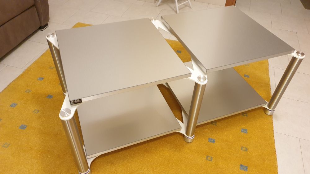 Vendo in condizioni ex-demo ( praticamente nuovo ) tavolo porta elettroniche Hi-Fi Dem Audio serie armonia con 4 ripiani, telaio bianco e ripiani in silver spazzolato, i piu' costosi. I ripiani sono in LISOCORE , molto leggeri e robusti. Prezzo 1200 euro trattabili, prezzo di listino 1500.