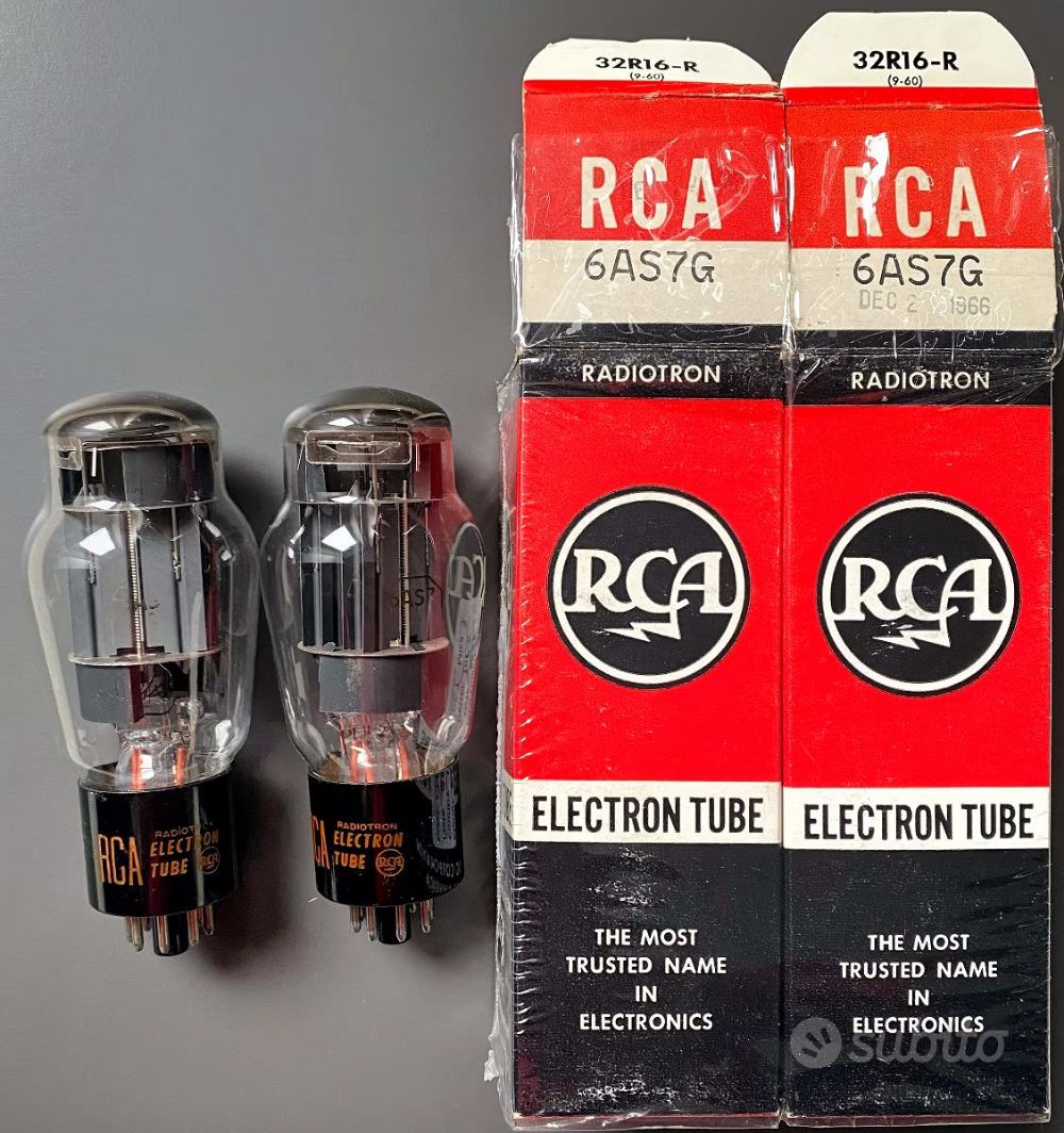 Coppia matchata doppi triodi RCA 6AS7G NOS NIB del 1966 black plate 'O' getter (6H13GC 6H5C CV2523 6080). Stesso lotto same batch. Selezionate testate nuove mai usate selected tested. Valvole rohre tubes utilizzate su Audio Tekne IT2 ed altri apparecchi. Spese di spedizione a carico dell'acquirente
