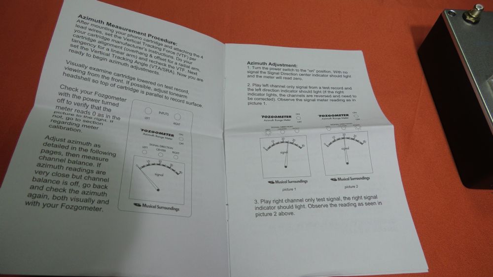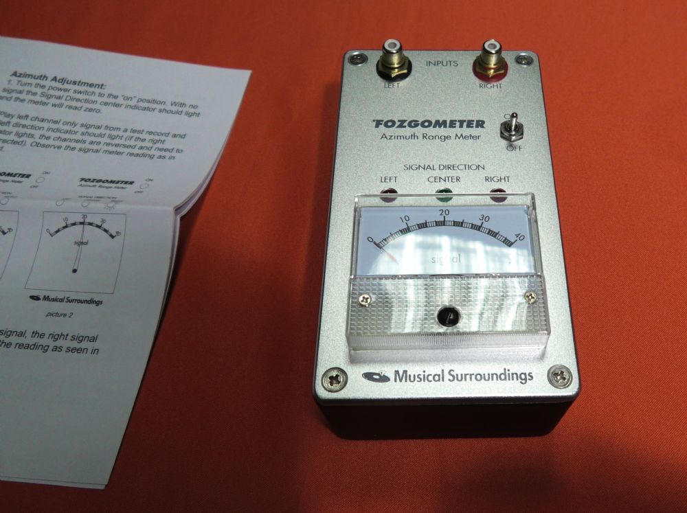 L’apparecchio che più di ogni altro richiede una certa accortezza per la messa a punto è il giradischi, nel quale diverse regolazioni giocano un ruolo di primo piano. L’azimuth della testina, il VTA (ovvero l’altezza del perno del braccio), l’antiskating, la forza di appoggio, l’angolo di perpendicolarità, l’isolamento dalle vibrazioni, la messa in piano, ecc. sono tutte voci che l’audiofilo ben conosce e che sa di dover settare se vuole ottenere le migliori prestazioni dal suo sistema analogico. Forse sta proprio in queste “complicazioni” la fortuna del ritorno dell’analogico. Con il giradischi, in definitiva, gli audiofili si possono complicare la vita a dovere ed hanno la possibilità di “giocare” con le proprie regolazione alla ricerca del nirvana. Per questi settaggi occorre pazienza e cura, tra l’altro su alcuni giradischi i settaggi devono avere anche una certa periodicità perché non sono infrequenti fenomeni di staratura. Queste regolazioni però fanno la differenza e spesso danno all’audiofilo il compiacimento di avere ottenuto un miglioramento grazie alle proprie capacità, come se l’audiofilo avesse operato un paziente che ora dichiara di sentirsi meglio. Spesso è un gioco di attenzione e di abilità, a volte anche di buona vista, man mano che le regolazioni diventano sempre più fini per arrivare al massimo risultato ottenibile. Dalla nostra esperienza, uno dei settaggi fondamentali per la buona riproduzione di un giradischi è la regolazione dell’azimuth della testina, ovvero della regolazione dell’angolo tangenziale di lettura del solco che permette allo stilo di leggere l’intera superficie del disco con un angolo più che mai perpendicolare. Sul mercato si sono viste dime di ogni tipo, da quelle semplici in cartone che si possono anche costruire da soli stampando i pdf che si trovano in rete, a modelli in plastica od addirittura in alluminio (questi ultimi sicuramente più costosi). Poi però è tutto un discorso di manualità ed avere la certezza di operare nel modo corretto non è semplice, poichè spesso è difficile intercettare i giusti riferimenti e parallelismi. A volte la forma della testina con lati non paralleli o smussati non aiuta a trovare il giusto riferimento; ad una certa età, inoltre,la vista fa brutti scherzi ed è necessario operare con buone fonti di luce. In tutti i casi poi rimane il dubbio, nel nostro cervello, di non essere riusciti ad operare al meglio e di avere tralasciato qualche cosa. Jim Fosgate, grande appassionato di vinile, attempato ingegnere ed imprenditore in ambito audio, questa preoccupazione ben la conosce e da grande inventore quale lui è, ha pensato di togliere questo dubbio agli audiofili e permettere loro di dormire notti tranquille. Ha progettato in poche parole un semplice strumento, il Fozgometer prodotto da Musical Surrounding, in grado di misurare scientificamente il grado di messa a punto dell’azimuth della nostra testina, non tanto attraverso la misurazione geometrica ma andando a misurare direttamente il suono emesso. Attraverso uno speciale ampio wu meter è possibile misurare con semplicità il segnale del canale sinistro e destro e verificare con la massima precisione possibile se la nostra testina è ben regolata confrontando la quantità di segnale dei due canali. Musical Surrounding è una società americana che distribuisce prodotti analogici high end e produce in proprio interessanti preamplificatori phono contraddistinti da un ottimo rapporto qualità prezzo. Ha inteso sviluppare questo ultimo progetto di Jim Fosgate, mettendo sul mercato un utile accessorio dotato di una veste estetica curata. L’oggetto è completamente in metallo, con angoli arrotondati, con la parte superiore cromata e ben rifinita e dotata di connettori rca di prima qualità. L’impressione è quella di avere tra le mani uno strumento di misura di alta qualità, made in USA, sensazione avvalorata anche dal peso, non indifferente, del dispositivo. E’ alimentato da una batteria a 9 volts che deve essere inserita all’interno del circuito svitando le 4 viti a croce cromate che si trovano nel pannello superiore. Il Fozgometer permette di misurare la separazione dei canali, il loro bilanciamento e la direzione del segnale in modo semplice ed accurato. Istruzioni particolareggiate ci guidano passo passo. Ci dicono che, prima di eseguire la prova, dovrà ovviamente essere montata la testina seguendo le indicazioni del costruttore per quanto riguarda il peso (VTF) e l’altezza del braccio (VTA) ed avere verificato che la conchiglia sia esattamente parallela al piano del disco Per le regolazioni è necessario utilizzare il disco test The Ultimate Analogue Test LP edito da Analogue Production in vendita nel nostro negozio o nello store on-line. L’apparecchio è in condizioni pari al nuovo con istruzioni ed imballo originale.