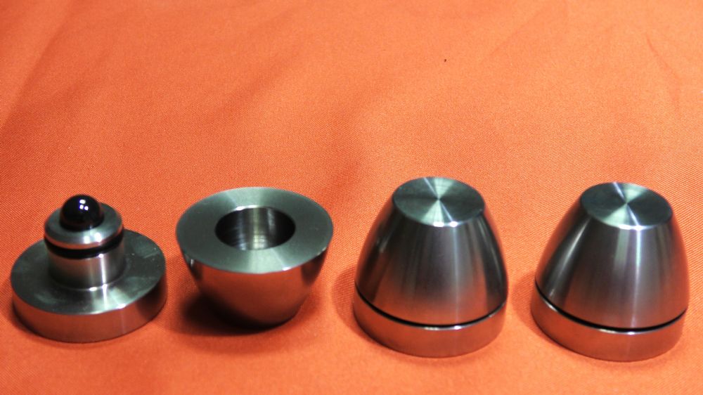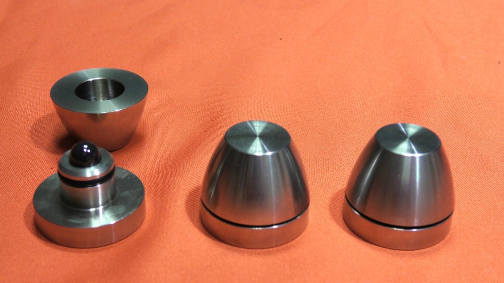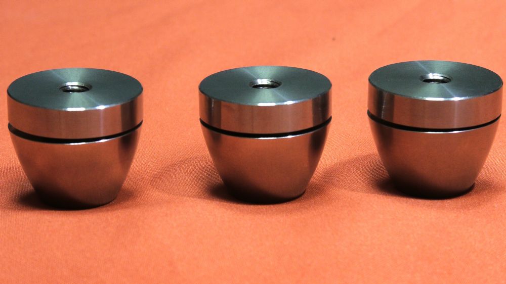 Caratteristiche tecniche · Materiale: acciaio inossidabile di precisione, sfera ceramica high- tech · Altezza utile: 30 mm · Dimensioni: Ø 20 mm (parte superiore), Ø 35 mm (parte inferiore), · Capacità di carico: 150 kg (set di 3)