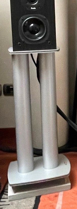 Vendo coppia di stand Dynaudio 4 versione silver, buone condizioni generali con 2 segni in posizioni non visibili, senza imballi. Sono gli stand originali delle Dynaudio C1, a cui i diffusori possono essere solidalmente fissati con viti alla base degli stand, riempibili di materiale inerte e dotati di passacavo ma utilizzabili anche con altri minidiffusori da posizionare attorno ai 65 cm dal pavimento. Base sup. cm 23,5 x 19 che permette di supportare sia diffusori con base profonda che mini con la larghezza maggiore della profondità , base inf. cm 24 x 30 , altezza da terra con punte circa 64 cm, solidi e pesanti, ulteriormente appesantibili con filler da inserire nelle colonne, più robusti delle serie attuali di stand Dynaudio. Completi di basi in pietra serena comprese nel prezzo, utili in caso di necessità di variare altezza dei diffusori di circa 3 cm in più, posizionandole a seconda delle necessità sia sotto gli stand che tra la base di appoggio degli stand e i diffusori. Non spedisco se non a cura e costi da concordare con l’ acquirente, possibile ritiro diretto in Mi zona NE con sconto, consegno MI e hinterland.