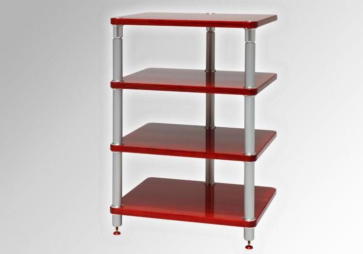 Tavolo porta-elettroniche a quattro ripiani differenziati realizzati in legno massello di frassino, struttura modulare portante in alluminio ricavata dal pieno e unita tramite viti, piano superiore disaccoppiato tramite sfere di precisione e sistema anti-scalettamento, verniciatura rossa a sei mani.