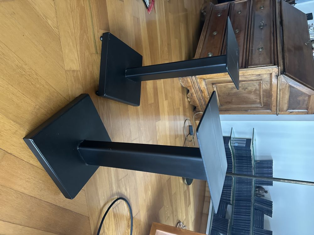 Costruzione molto robusta, elegante, semplice. Sono dotati di piedini regolabili; altezza cm. 63, base 30 X 30, piano di appoggio dei diffusori 20 X 30. Dato il peso non spedisco, visibili a Verona.